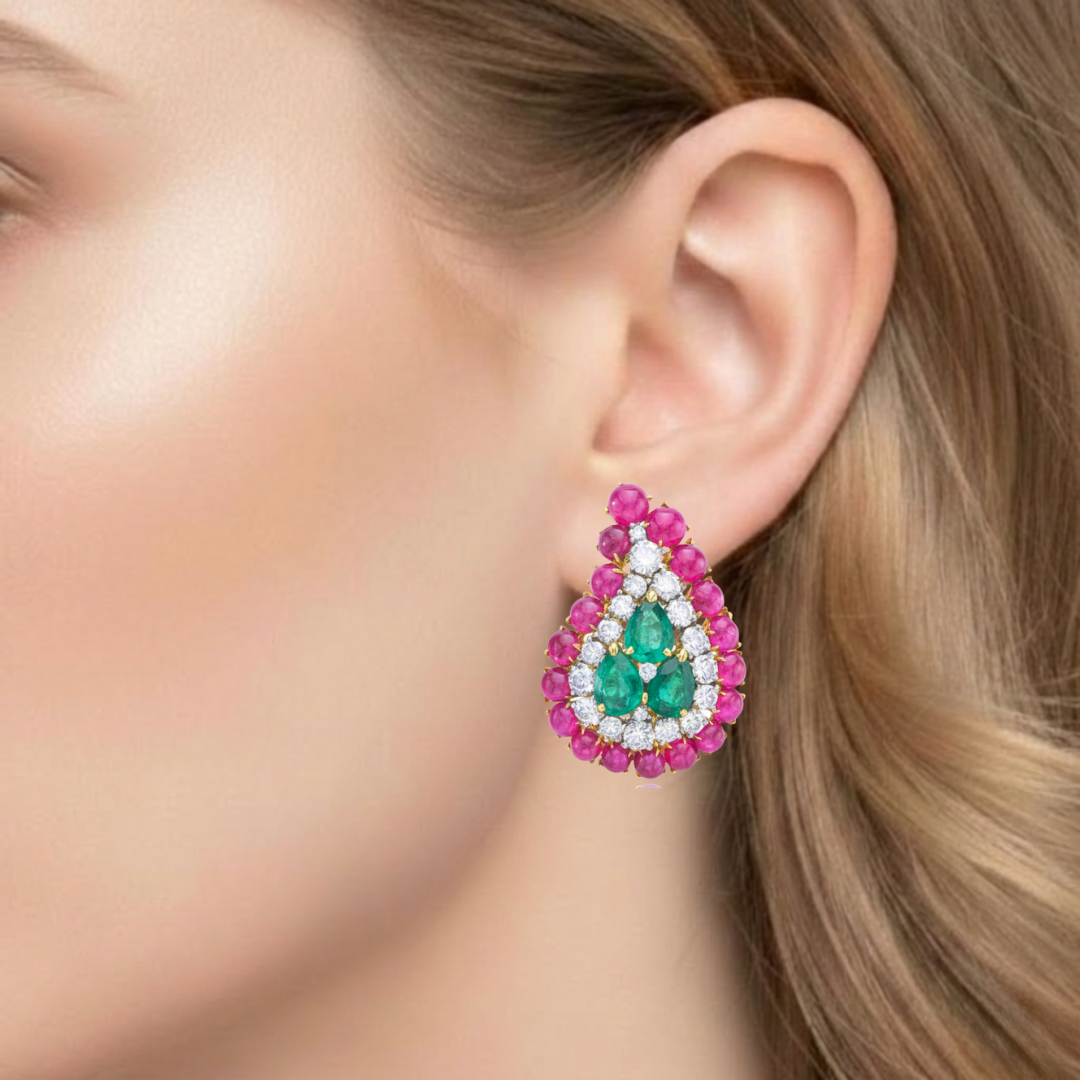 Vivid Pear-Cut Emerald Cluster Earrings with Ruby Cabochon Border