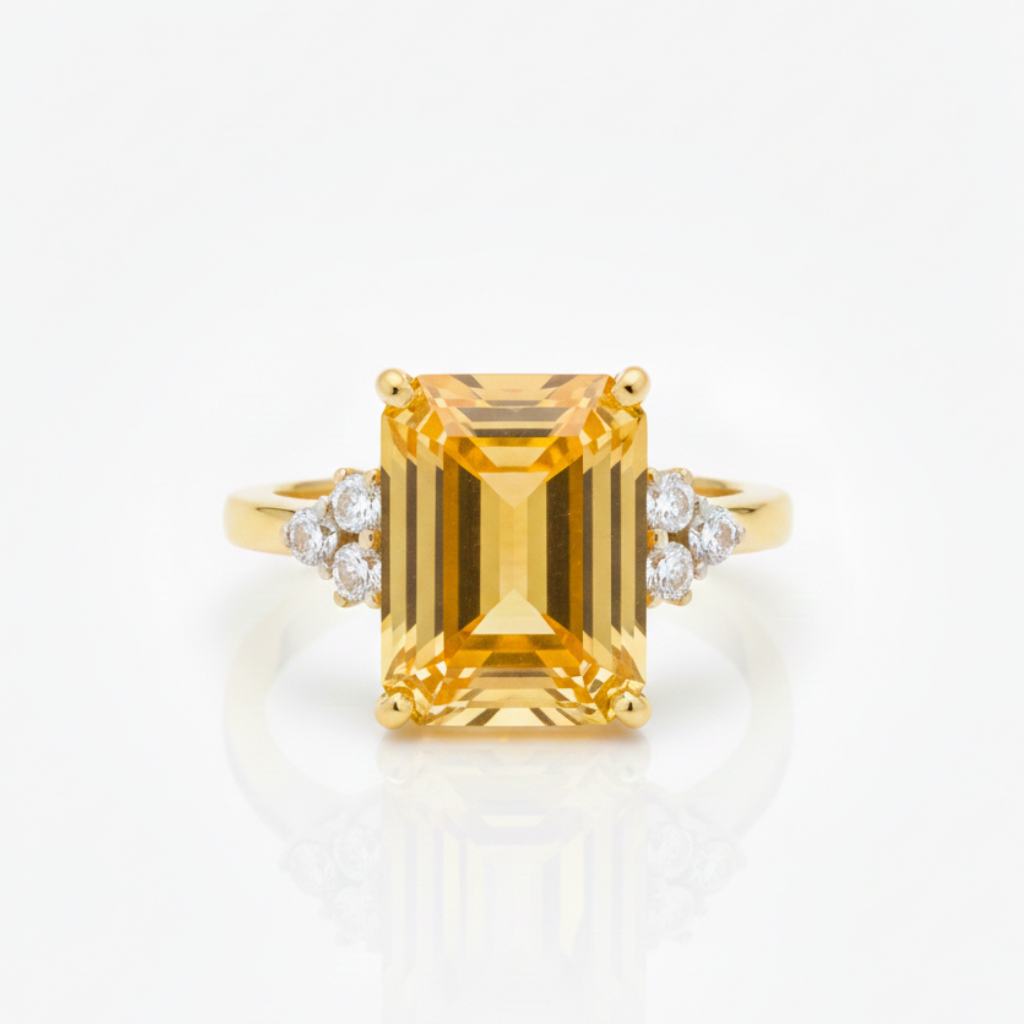 This striking Emerald-Cut Citrine and Diamond Three-Stone Ring features a large, honey-hued citrine as its radiant centerpiece. The gemstone is meticulously emerald-cut to showcase its exceptional clarity and warm, golden tones, and it is secured by four polished yellow gold prongs.